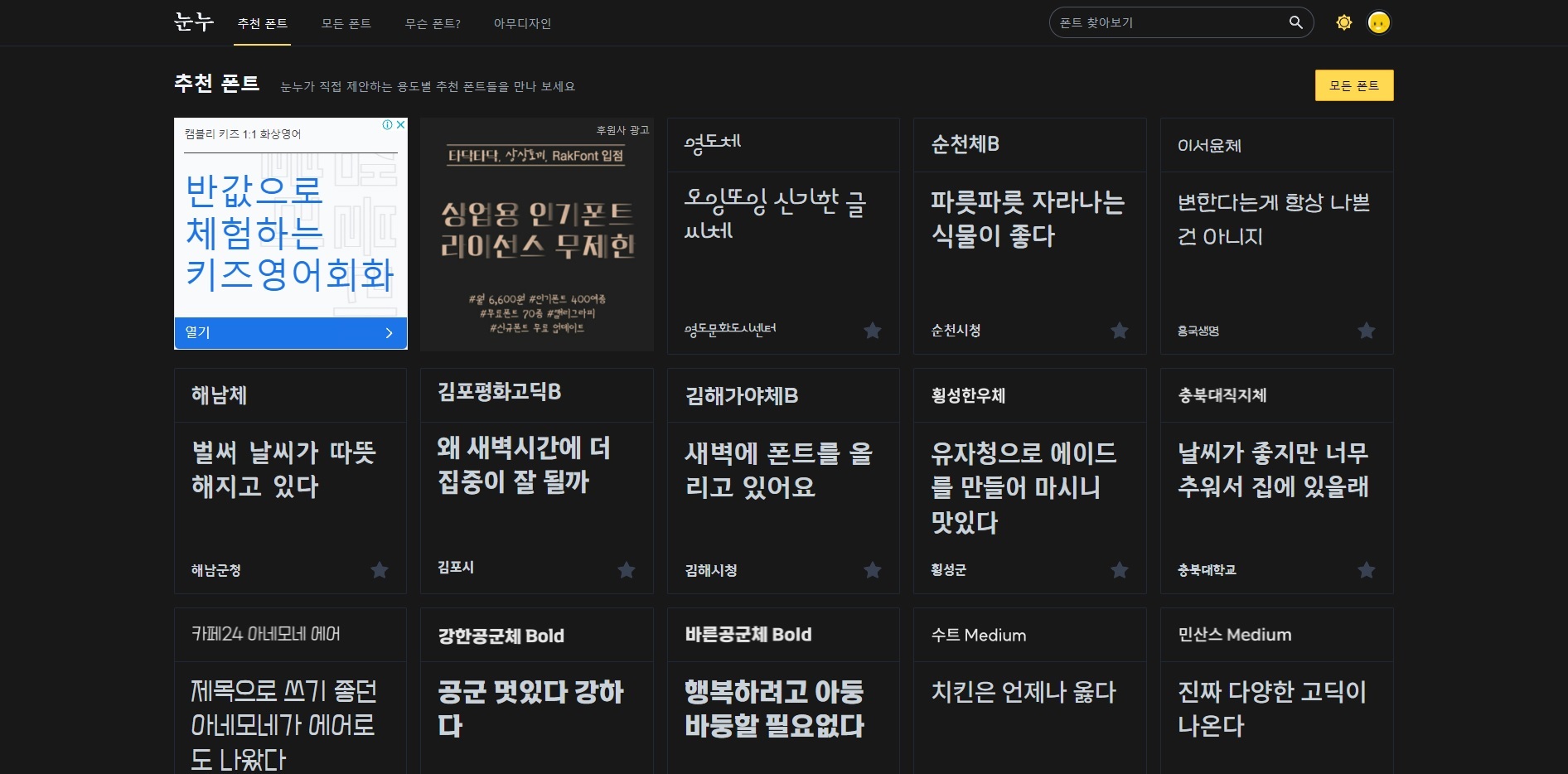 산돌 구름다리 등 다양한 유료 글꼴도 많지만, 눈누 사이트에서 한꺼번에 확인하고 무료로 사용할 수 있다는 점이 유용하여 디자이너라면 즐겨찾기에 꼭 들어있는 사이트가 아닐까 싶습니다.
