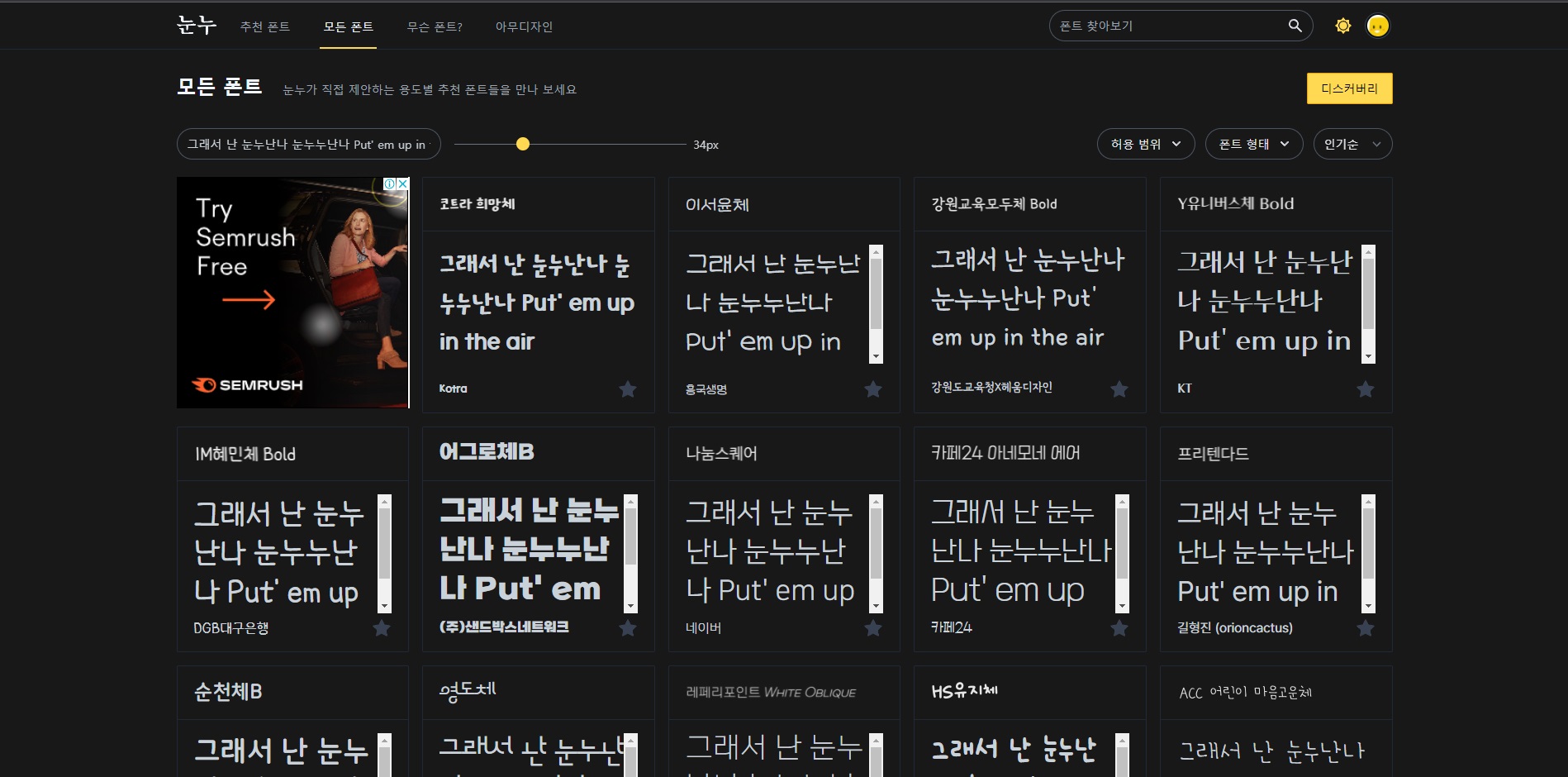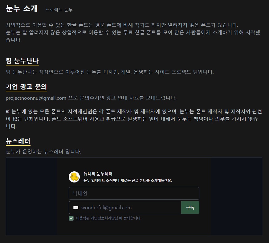 눈누 사이트는 상업적 이용이 가능한 한글 글꼴 모음 사이트입니다.